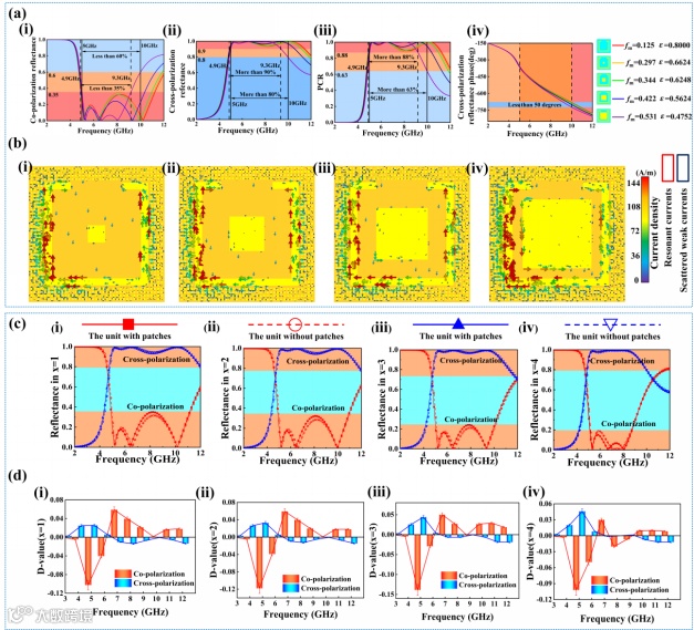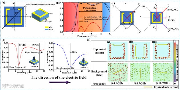 针对上述挑战,团队研究人员从跨尺度设计和嵌套解耦的理念出发,设计了一种巧妙的“无创”多频谱集成元器件。针对微波波段的伪装目的,设计了一种高效的极化旋转器,用于实现宽带的线极化波的交叉极化旋转,并且理论分析和仿真验证了其极化旋转机理。接着,从宏观表征尺度出发,利用极化旋转器表面的广阔空间和金属的低红外辐射特性,嵌入不同尺寸的金属贴片,通过设计单元表面整体的金属占空比实现红外辐射特性的动态调控。通过错开金属贴片和计划旋转单元的谐振频率,实现微波红外两个频段的解耦设计,最大限度降低了红外辐射特性的调控对单元微波性能的干扰。