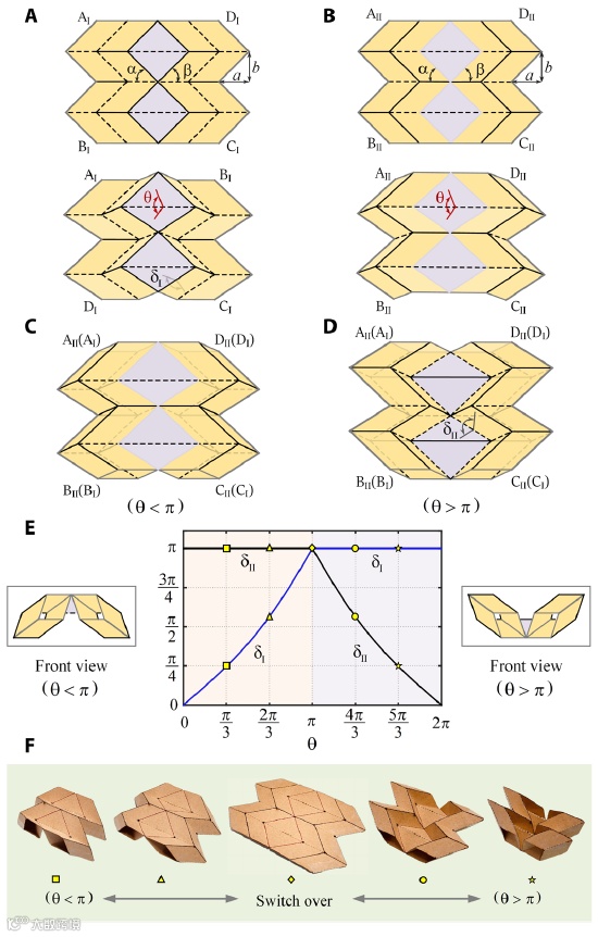 变形结构一直受到科学家和工程师的关注。这些结构的一个基本特征是其形状变化能力和随之而来的机械性能变化。较新的结构可以根据需求进行编程,有些甚至可以适应其操作环境。目前存在一系列受折纸启发的变形结构,因为这些简单的物体通常具有其他结构无法比拟的丰富几何特征。折纸变形结构已在机器人技术、机械超材料和航空航天可展开结构等领域得到广泛发展。为了实现变形,一些折纸结构依靠折痕的山谷分配切换来改变折叠运动,而另一些折纸结构则利用材料的灵活性来获得多稳态变形结构。目前,大多数此类结构采用特定的变形机制或设计,几乎所有功能都源于此。换言之,一旦确定了结构设计,它很少能获得与原始设计无关的新配置,因此也很少能获得新功能,明显缺乏可重构性。