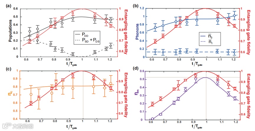 被定义为可以提取的能量(即有用能量)在输出能量中的占比。为了更深入地了解纠缠对量子引擎的作用,人们需要定量地分析量子引擎在工作物质处于不同纠缠度下的性能,这在实验上可以通过控制第一冲程纠缠门的作用时间来实现。同时,通过测量工作物质中被吸收的光子数和负载中增加的声子数,研究人员得到了不同纠缠度下的