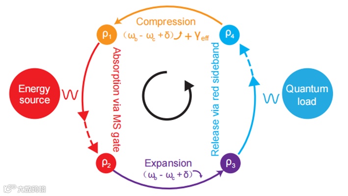 图一、量子热力学循环过程,其中第一个冲程通过实现纠缠逻辑门(MS门)吸收光子;第二个冲程是快速地降低激光失谐;第三个冲程是通过红边带与负载耦合输出声子;第四个冲程是在耗散下增大失谐量来完成循环。