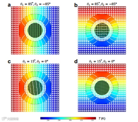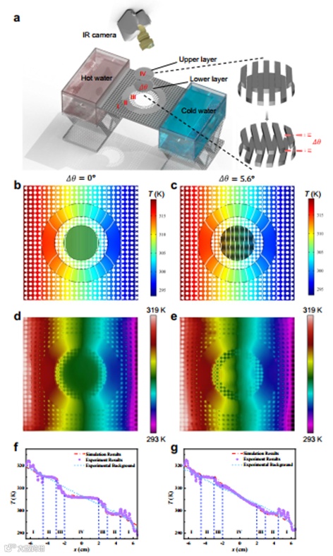 近日,新加坡国立大学电子与计算机工程系讲座教授仇成伟老师和浙江大学李鹰老师团队,鉴于转角电子学和光子学在魔角处对电子或光子传输具有反直觉的调控特性,首次实现了基于线性莫尔条纹的动态宏观转角热场调控手段,完成了“热隐身”,“热旋转”,“热透明”和“热集中”之间的宏观动态热场调控,特别是扭转到类比的“热魔角”处会引起等效热导率的拐点出现,从而促使热功能从“热隐身”转变为“热集中”。