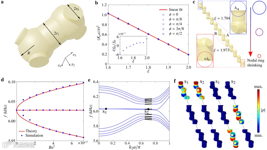 近日,新加坡南洋理工大学张柏乐和Yidong Chong、江苏大学的孙宏祥以及香港中文大学的薛浩然团队在声子晶体中实验实现了平坦的3D LL。声子晶体原胞在没有形变的情况下,能带结构包含一个节点环。原胞中引入形变会导致能带结构中的节点环收缩。通过设计非均匀的结构形变在整体样品中成功引入赝磁场,导致节点环分裂成 3D LL(平带),其方式类似于从Dirac点形成 2D LL。这种3D平带可用于增强非线性效应,并产生有趣的3D现象,例如逆安德森局域化。声子晶体的设计还可能有助于开发承载 3D 朗道能级的固态材料,该材料可以访问低维平带系统中未发现的相关电子相。