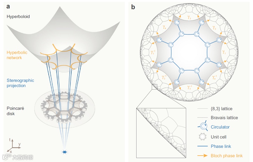 非欧几里得几何的引入是19世纪初对宇宙理解的重大转折点,其中双曲几何学在广义相对论中尤为重要,用于描述时空的几何曲率和黑洞的事件视界。尽管双曲几何学在理论物理中有着重要地位,但在实验物理中的应用仍然具有挑战性。双曲晶格在欧几里得图像中的可视化以及双曲空间中非平凡物理的探索,激发了对这一领域的兴趣,作为一种新型合成材料的概念,它们基于非欧几里得空间中的规则镶嵌,具有恒定的负曲率。其支持的布洛赫波与欧几里得晶格中的布洛赫波不同,它们属于非交换的双曲平移群,这导致了双曲动量空间中独特的光谱和带拓扑。这种材料在理论上已经被广泛研究,尤其是在拓扑介质方面,但实验研究主要局限于由耦合离散共振组成的时间反演不变系统,尚未涉及到鲁棒的单向边界波传输这一更有趣的情况。