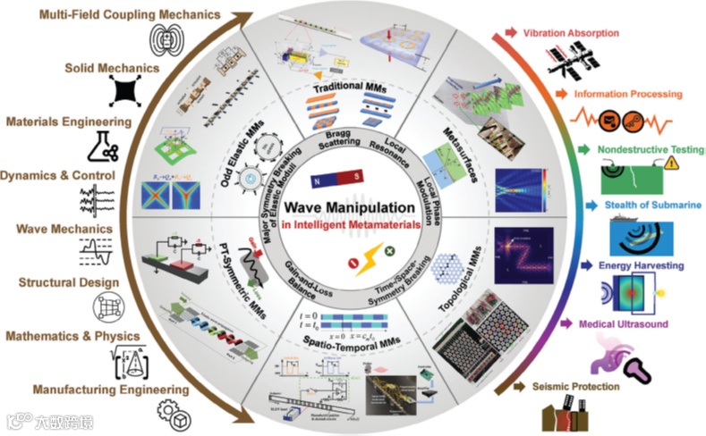 近日,哈尔滨工业大学周伟建教授与浙江大学陈伟球教授撰写综述,全面回顾了在电/磁-机械耦合超材料中传播的声波/弹性波的智能操控的最新进展。这些智能超材料由压电/压磁材料或软介电/磁流变弹性体组成。该综述总结并论证了如何利用电/磁机耦合效应设计智能超表面、智能拓扑超材料、智能非厄米PT对称超材料、智能奇弹性超材料和时空调制超材料的策略。每个主题都从基本定义开始,然后深入讨论分析方法、计算技术和实验实施。有选择地提出了一些代表性的例子,并解释和讨论了潜在的物理机制。可以得出的结论是,通过设计和利用智能超材料,可以实现对新颖奇特的声/弹性波特性的主动甚至智能操控,这是增强和扩展超材料实际应用的必然趋势。