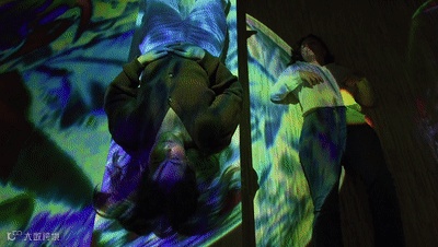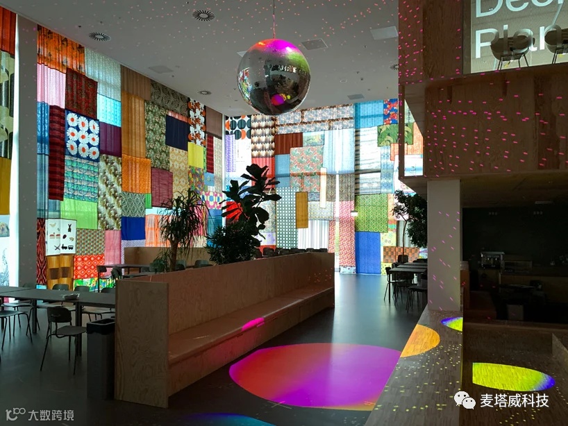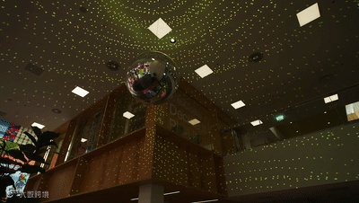 抬头可见一只亮闪闪的金属镜球,将投影在它身上的画面反射、粉碎成数千个旋转的光斑,迪厅style没错了!