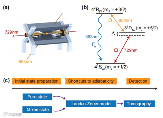 图一、(a)囚禁离子阱系统,这里729nm激光方向与离子阱的轴向方向相同,854nm激光方向与离子阱轴向方向呈45°。(b)40Ca+离子的能级结构,这里双向箭头和波浪箭头分别代表激光照射和耗散。(c)从初态到最终探测的实验步骤。