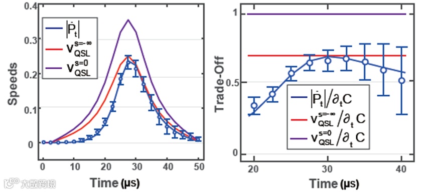 图二、(左):实际速度与两种量子速度极限随时间演化的比较。(右):在朗道-泽那模型的免交叉时间窗口内,实际的量子速度-功耗权衡关系与理论上的量子速度-功耗权衡关系之间的对比。其中蓝色数据点为实验测量值,蓝色线条为对实验值的拟合,误差棒为50000次测量的标准差;红色线条为本项目得到的最优理论结果;紫色线条为Wigner相空间中的理论结果。