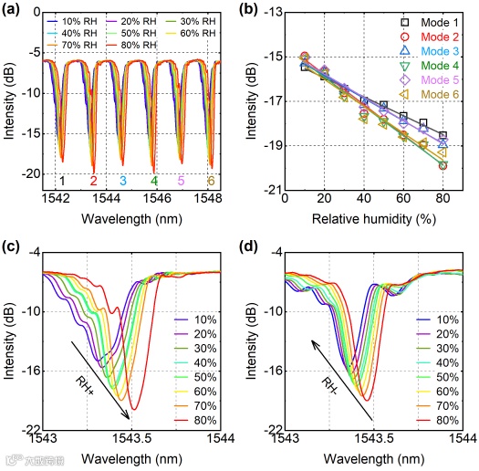 相对湿度(RH)监测在食品储存、卫生监测和农业生产领域发挥着重要作用。与传统的电湿度传感器相比,基于光纤的湿度传感器在的各个领域得到了广泛的研究和应用。基于光纤的RH传感主要依赖于光纤表面涂覆的湿敏感材料在吸湿解吸过程中的折射率变化。这种折射率的变化可以进一步导致光纤RH传感器的测量光谱的波长偏移或/和强度的变化。不同的湿度敏感材料在响应时间、灵敏度和稳定性方面表现出不同的性能。