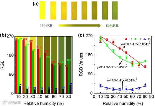 图1 不同湿度环境下湿度敏感膜的颜色变化:从10%(黄色)到80%(绿色)