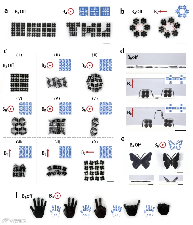 团队构建了多样化功能的磁驱动柔性驱动器,实现了折纸、剪纸、图案化变形(图2),以及六爪抓取、树叶飘动、章鱼游泳、蠕虫蠕动等仿生运动(图3)。