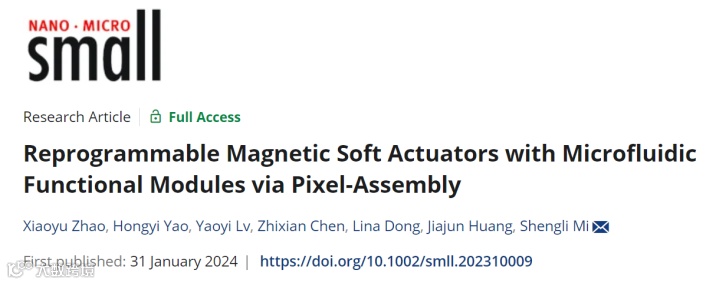 相关研究成果以“Reprogrammable Magnetic Soft Actuators with Microfluidic Functional Modules via Pixel-Assembly”为题发表在《Small》上。本文通讯作者为清华大学深圳国际研究生院弥胜利教授。第一作者为清华大学深圳国际研究生院2023级博士生赵笑宇。该工作得到了国家自然科学基金委和深圳市发展和改革委员会战略性新兴产业发展专项资金扶持计划的支持。