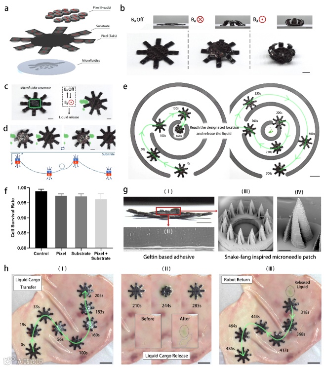 随后团队将微流控功能模块集成到硅胶基底层,应用于微流控芯片的开关阀控制、芯片曲率调节、流体混合、动态微流控芯片结构的构建,并开发了一款液态药物递送的磁驱动爬行机器人。该机器人结合毒牙式微针,具备体内定点药物释放的应用潜力,如图4所示。该微针阵列由摩方精密microArch® S230(精度:2μm)制备完成,12根微针均匀分布在圆环基底上,单个针体呈圆锥形毒牙状,底部直径为250μm,高度为450 μm,SEM图像显示了微针的毒牙状形貌(图4g)。
