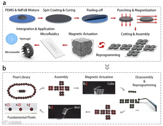 近日,清华大学深圳国际研究生院弥胜利教授团队报道了一种像素组装式的磁控柔性驱动器的制备工艺,可应用于低成本、可回收、可重编程的磁控驱动器的构建,实现定制化结构变形与仿生运动(抓取、游泳、蠕动等),并集成微流控功能模块可用于开关阀控制、曲率调节、动态芯片结构与液体药物输送机器人等。