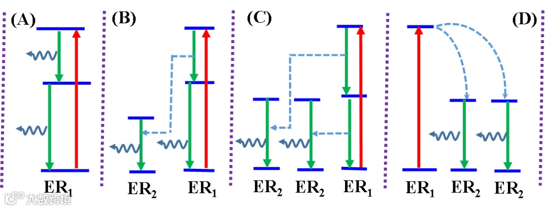 产生一个光子发射,其自身经过能量传递退激发到较低激发态产生第二个光子发射;C过程是敏化剂离子将能量分两步传递给两个激活剂离子(可以是同种或不同种),激活剂离退激发后发射两个光子;D过程是合作发光过程,即一个激发态离子将能量同时传递给两个另外稀土离子,接受能量的两个稀土离子退激发后产生两个光子发射。