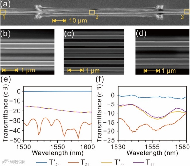 图2 非对称储传输的仿真及实验结果。(a-d) 器件的扫描电子显微镜图片及其局部放大图,(e, f) 仿真和实验中输出端口的透过率谱线