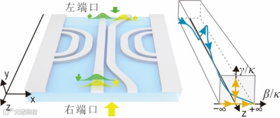在量子力学中,当非厄米系统的能量与环境进行交换,哈密顿量的两个或更多的本征值和本征态可同时简并,即出现奇异点。由于薛定谔方程与亥姆霍兹方程的形式相似,这些概念被引申至光学领域,哈密顿量参数与光波导结构参数的变化相对应。在时间-宇称对称或反时间-宇称对称的哈密顿参量空间中,环绕奇异点进行动态参数演化,即可形成非对称传输。此时系统的输出模态仅依赖于环绕方向,而与输入无关,且两种环绕方向的输出模态不同。将其映射至光学平台,非对称传输表现为非对称的模式转换。