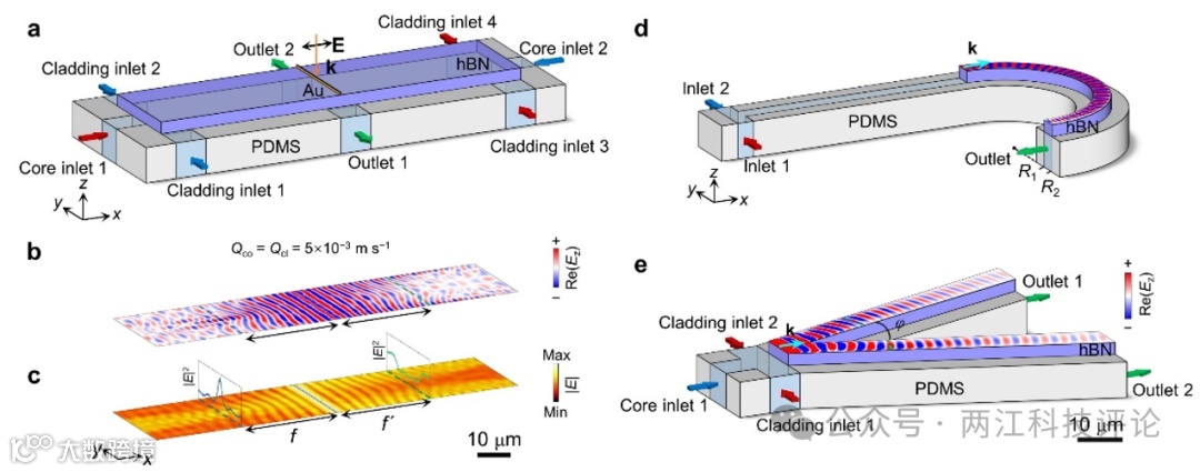 图4. 基于微流控技术的极化激元Janus透镜(a-c)、弯曲器(d)和分束器(e)。