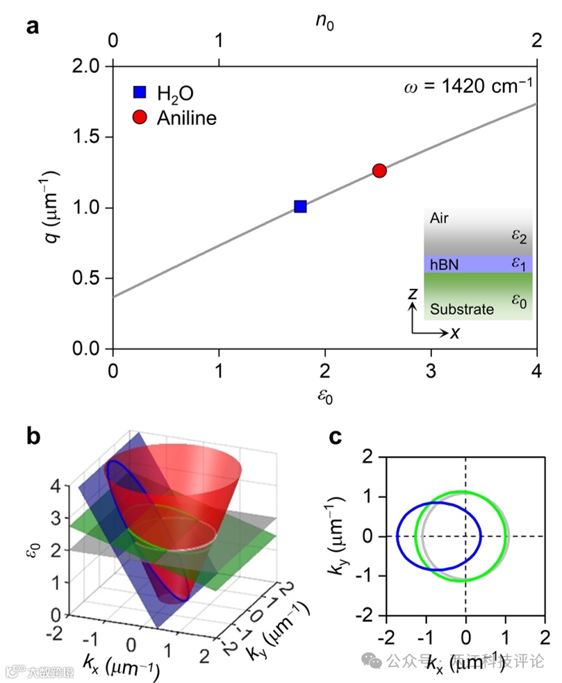 图1. 改变介电环境调控极化激元。hBN中声子极化激元的面内动量(a)和波矢等频面轮廓线(b, c)随基底的介电常数变化的对应关系。