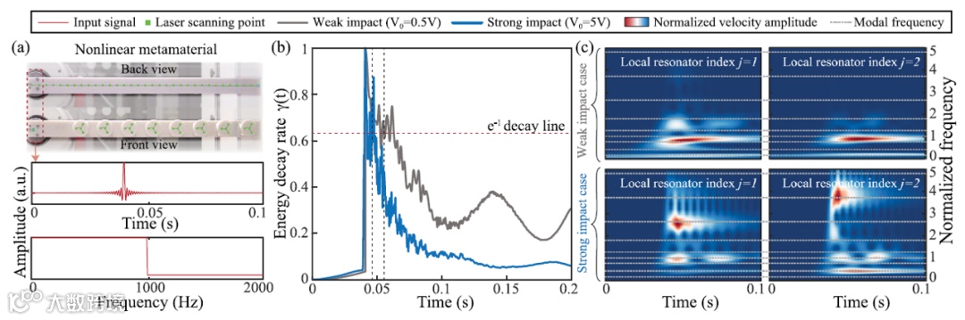 非线性超材料在不同冲击电压V0下的实验冲击波衰减。(a)具有激光扫描点和输入冲击信号轮廓的非线性超材料的实验装置;(b)非线性超材料在不同冲击强度下的实验能量衰减率;(c)速度的实验小波变换𝑤̇𝑟𝑗前两个非线性局部谐振器的两个不同的冲击情况