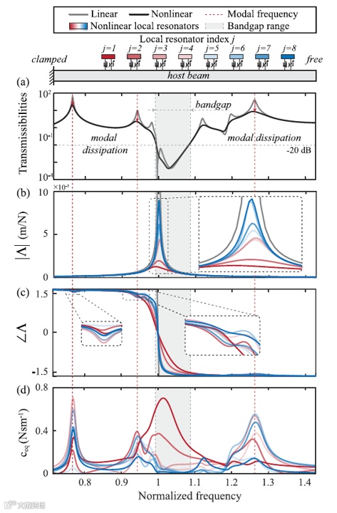 超材料中的非线性模态耗散。(a)模态频率下的振动衰减;(b)和(c):局域谐振器的频率响应函数的振幅和相位;(d)局域谐振器的等效阻尼