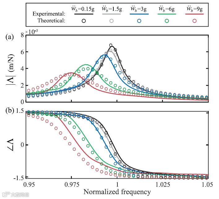 不同基础激励加速度𝑤̈𝑏下惯性放大器(𝜃=35°)的实验和理论频率响应函数𝛬