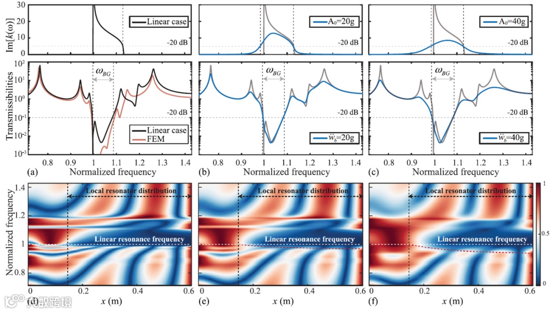 非线性超材料的尖端透射率和空间频率分析。(a)–(c):线性尖端透射率,𝑤̈𝑏=20g非线性,以及𝑤̈𝑏=40g非线性情况;(d)–(f):空间频率分析证明了线性,𝑤̈𝑏=20g非线性,以及𝑤̈𝑏=40g非线性情况