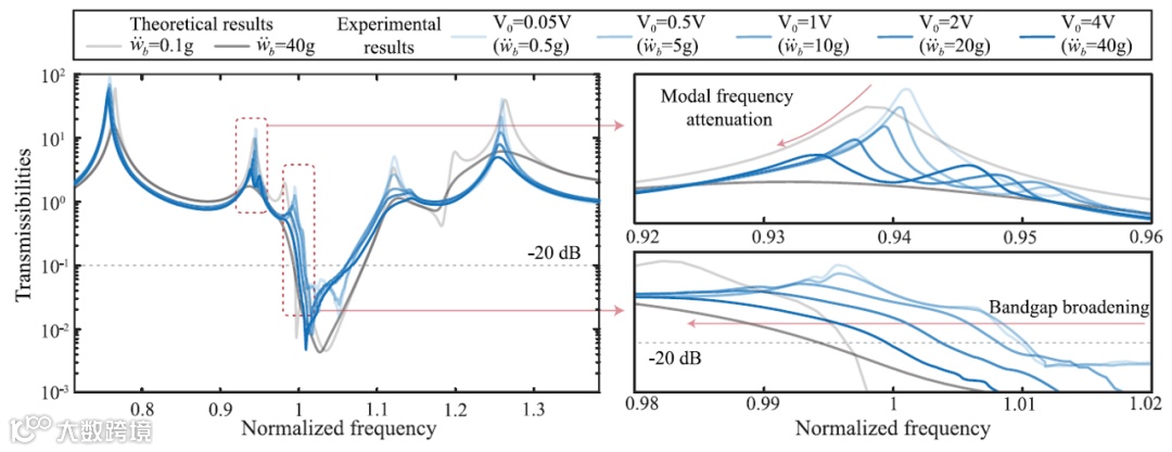 不同基础激励电压下非线性超材料的实验和理论透射率𝑉0和加速度𝑤̈𝑏