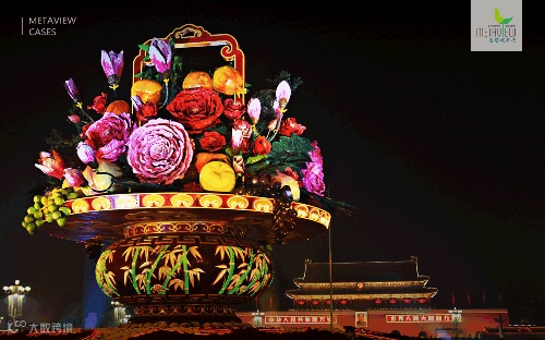 2013年国庆期间,在北京天安门广场大花篮篮体采用多媒体亮化方案,通过立体动画影像投射,赋予了景观生命活力,塑造首都城市新形象。