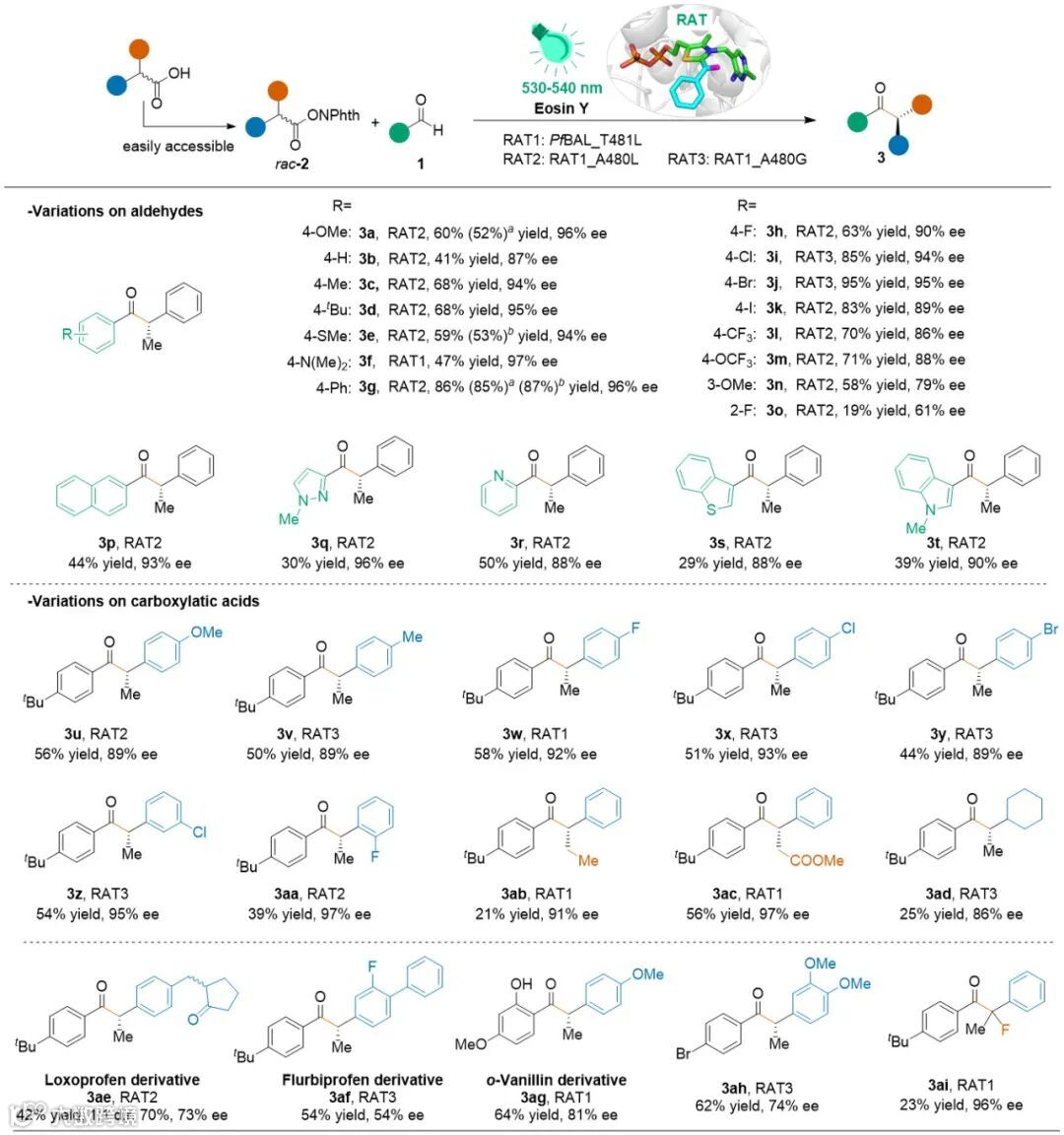 依赖酶的催化体系。随后通过分子动力学模拟和半理性设计构建了小而精的突变体库,能够快速、低成本地获取最优突变体酶。该体系有非常好的底物耐受性,能够接受的底物包括各种邻、间、对位取代的芳香醛、杂环芳香醛和各种取代基的羧酸衍生物。文章展示了