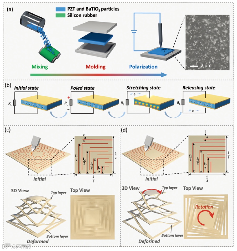 近日,德国莱布尼茨新材料研究所和萨尔大学Tobias Kraus教授联合浙江大学焦鹏程教授团队报告介绍了利用锆钛酸铅(PZT)和钛酸钡(BaTiO3)复合薄膜制造的超拉伸剪纸压电超构材料(KPM),用于感应由平面内和平面外位移引起的耦合大变形。KPM是通过在硅橡胶中均匀复合和极化压电颗粒(即PZT和BaTiO3)而制成的,并通过将压电橡胶薄膜切割成韧带来构造。表征KPM的电性能,并研究拉伸比高达200%应变的耦合大变形下的双稳态机械响应。最后,将PZT KPM传感器集成到无线传感系统中,用于检测车辆轮胎鼓胀情况,并将无毒的BaTiO3 KPM应用于人体姿势监测。所报道的剪纸压电超构材料为控制和操纵力学功能超构材料开辟了一个令人兴奋的场所,以便在许多应用中复杂变形场景下进行主动传感。相关研究发表在《Advanced Science》上。(徐锐)