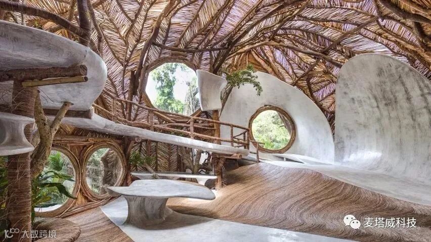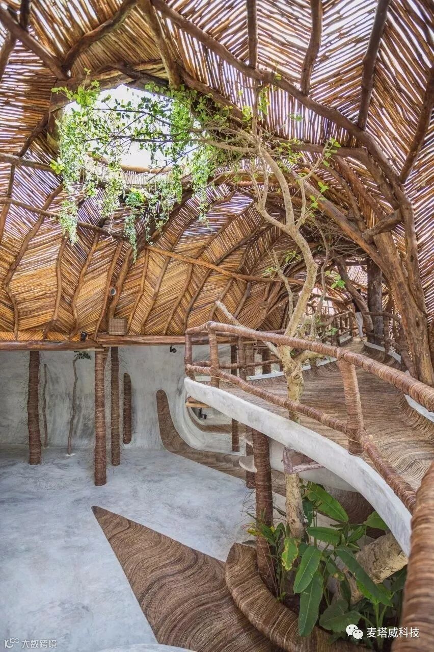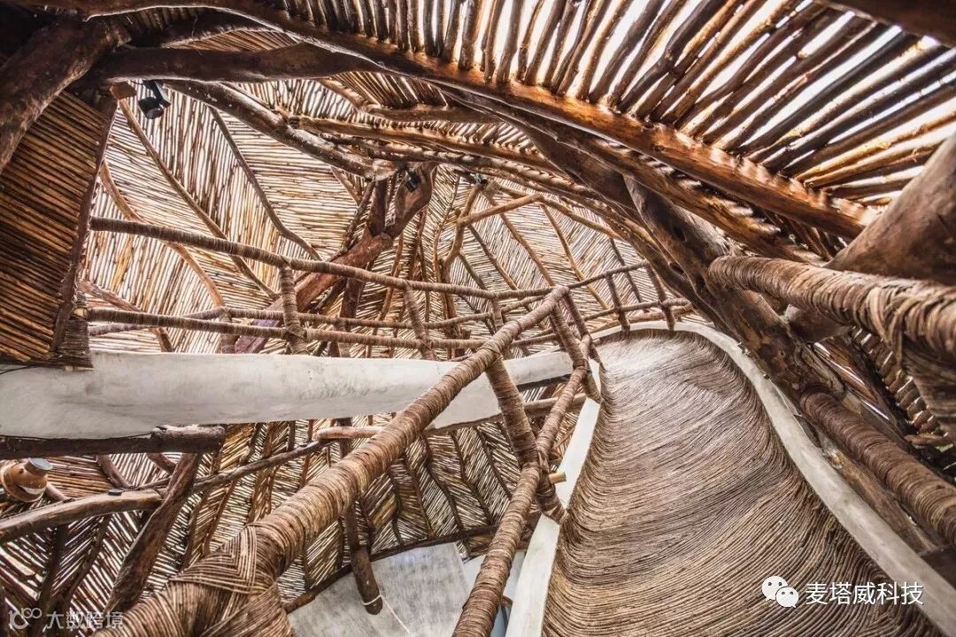 穹顶状的“沉浸式树屋”,使用了大量的原木材料。较大的树枝为不规则的穹顶提供了支撑,小的枝条则以对角线的模式排列在树枝之间,形成稳固的整体架构。