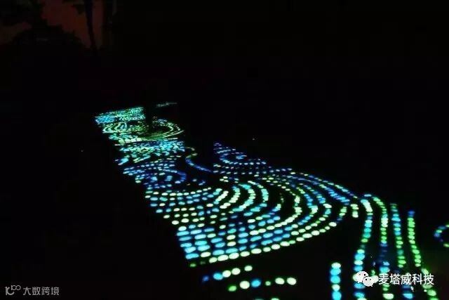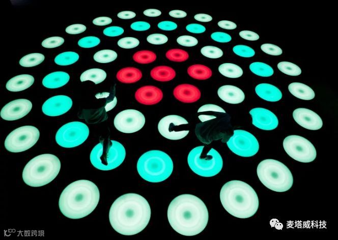 通过跳、跑、走等方式互动,底部感应装置根据脚步发出涟漪式扩散的灯光多人参与创造更加梦幻的效果!