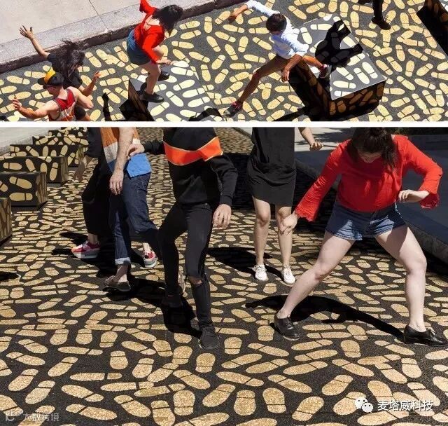 让人跳舞的金色街道用镶嵌金属和荧光物质铺设了超过五千个脚印,枯燥无味的步行街成为一个巨大的互动空间,使孩子们尽情释放出愉悦感。