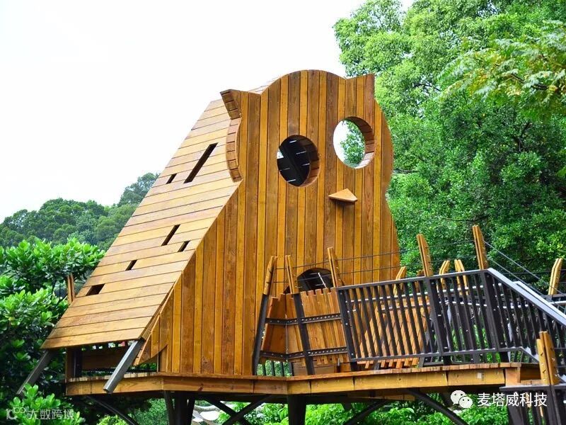 整体建筑为一栋木质树屋,主干道为一条夜光步道,径直可达到树屋,树屋周边区域设置有一批趣味新媒体雕塑。