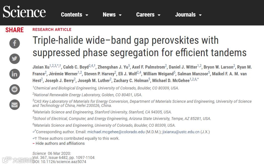 参考文献:Jixian Xu et al. Triple-halide wide–band gap perovskites with suppressed phase segregation for efficient tandems, Science, 2020.