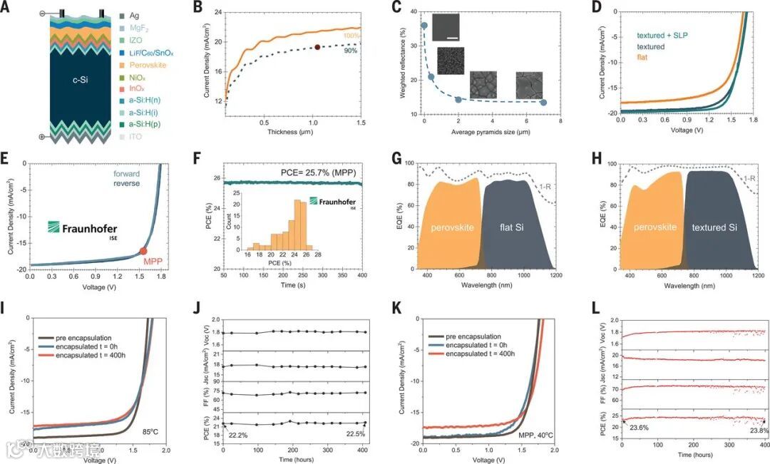 2)这些综合的增强功能使钙钛矿硅串联太阳能电池的独立认证效率达到了25.7%。在85°C下进行400小时的热稳定性测试后以及在40°C下在最大功率点跟踪400小时后,其性能损失可忽略不计。