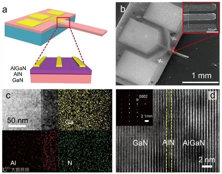 d.AlGaN/AlN/GaN异质结的高分辨透射电子显微(TEM)照片。