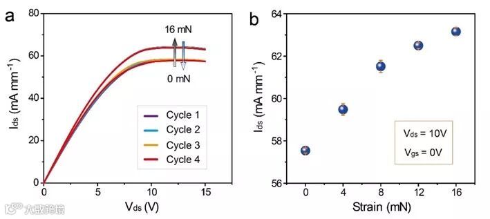 d,e. 栅压分别为-5 V和1 V时,SPD在不同应力(0-16 mN)下的输出特性曲线;