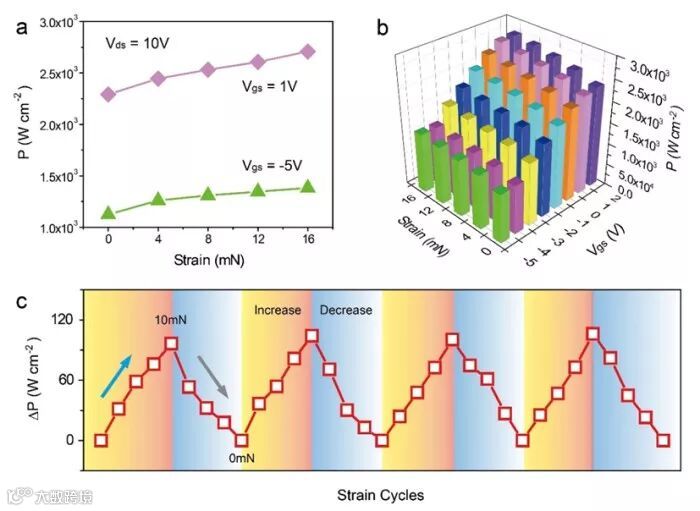 b.SPD的输出功率密度与输入应变和栅压的关系;