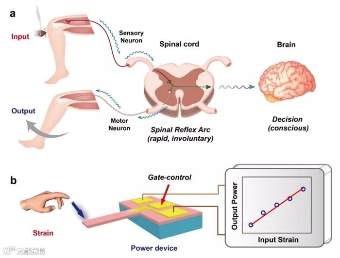 人体条件-非条件反射的复合系统是一个实时、灵敏响应/反馈外部机械信号的成功案例,例如在脊髓反射弧控制下腿部实时响应机械刺激的膝跳运动,同时仍受高位神经中枢监控。借鉴这种复合控制系统,近日,中国科学院北京纳米能源与系统所王中林院士和胡卫国研究员的研究团队基于压电电子学设计了一种新型智能应力调控功率器件(SPD),可以实现微弱机械信号对大功率密度电力的直接、实时、可编程调控,构建类似于条件-非条件层级控制系统。该研究成果以“Strain-controlled power devices as inspired by human reflex”为题,发表在近期的《自然-通讯》上。中国科学院北京纳米能源与系统研究所化麒麟副研究员、胡卫国研究员和王中林院士为共同通讯作者。该研究工作得到了国家自然科学基金、国家重点研发计划、中科院百人计划等项目资助。