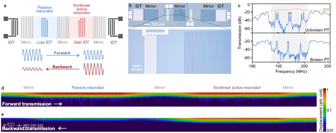 图1 基于声表面波 PT对称系统的非互易传输. a, 系统原理图; b, 器件照片; c, PT对称性破缺相和非破缺相的传输谱; d,e 对称性破缺条件下正向(d)和反向(e)输入的弹性位移场.