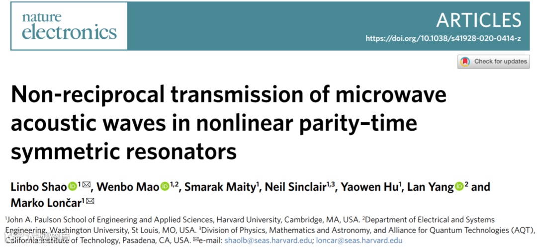 美国哈佛大学工程与应用科学学院Marko Lončar教授团队与圣路易斯华盛顿大学杨兰教授团队合作,在基于铌酸锂的集成声学平台上,实现了微波频段超声的非互易传输。所展示的基于声表面波的宇称时间对称系统推动了集成声学信号处理、全声子集成电路和非厄米物理的研究。相关研究工作近期以“Non-reciprocal transmission of microwave acoustic waves in nonlinear parity–time symmetric resonators”为题,发表于《Nature Electronics》 (DOI: 10.1038/s41928-020-0414-z)。
