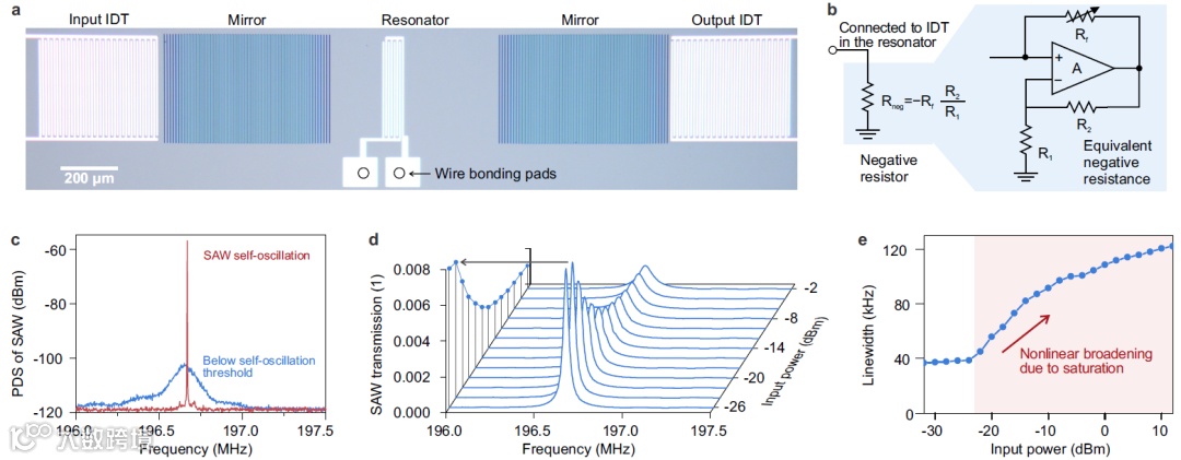 图2 声表面波和声学增益. a, 声表面波微谐振腔显微照片,声学增益由外部电路通过插指换能器(IDT)提供; b, 提供增益的负电阻电路图; c, 声表面波的自激振荡; d,e, 声表面波的非线性增益.