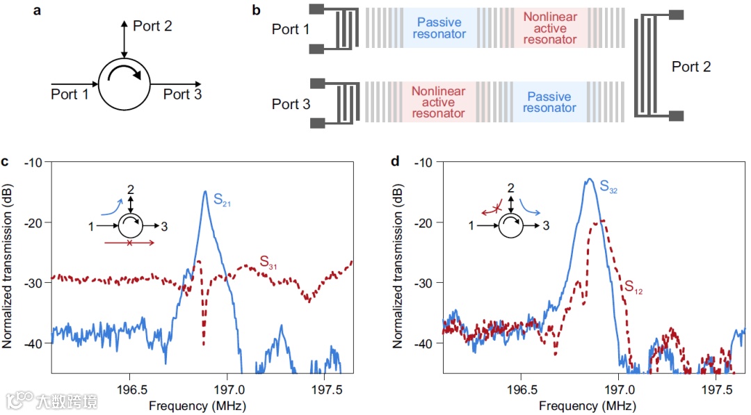 实验中,研究团队利用铌酸锂的低声学耗散和强压电效应特性,加工制备了高品质因子声表面波耦合谐振腔,并通过插指换能器(interdigital transducer, IDT)与外部增益(损耗)电路连接,实现了对声表面波增益(损耗)的实时调谐。实现的声学增益可以完全补偿谐振腔的本征损耗,并观测到声表面波的自激振荡(图2c)。同时,文章证实了对于不同传输方向的非对称增益是实现非互易PT系统的基本要素。