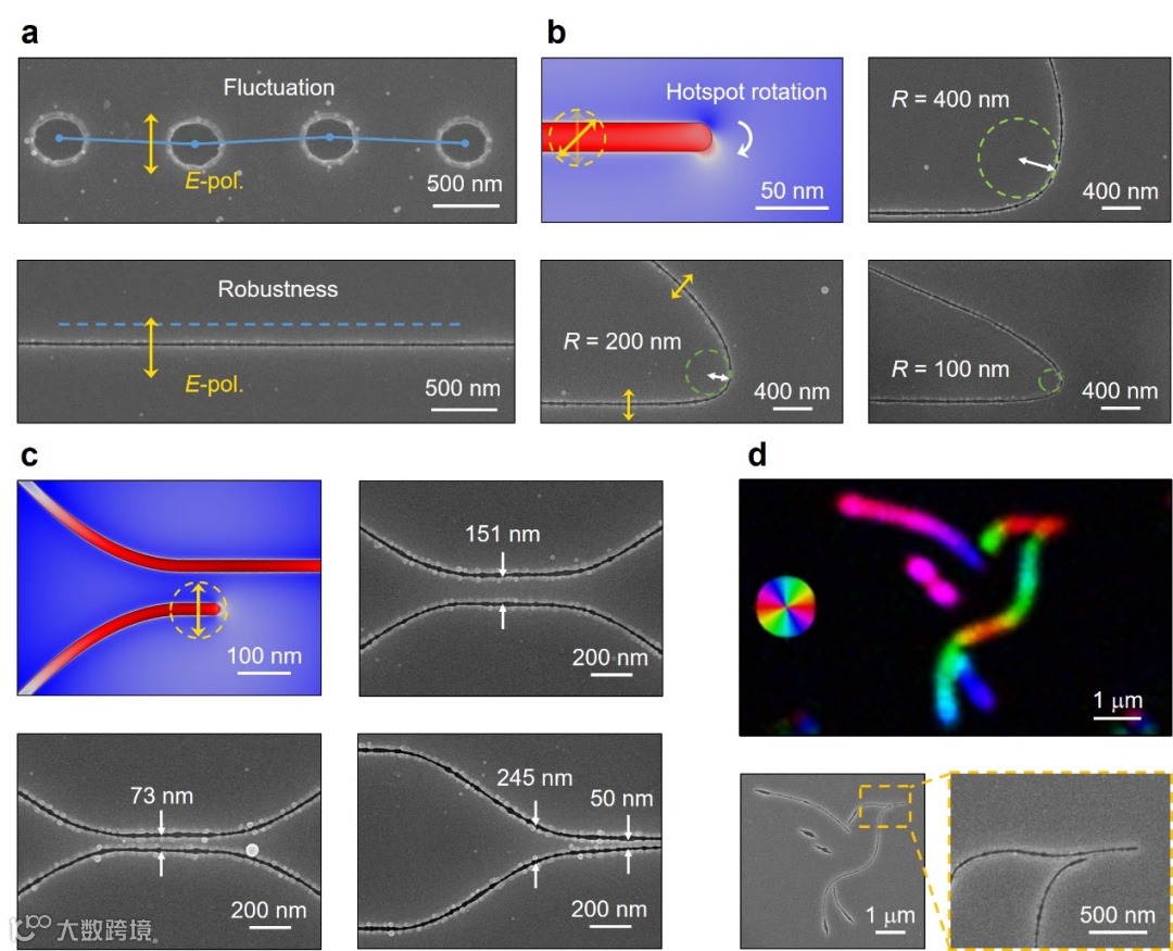 论文具体展示的分辨率为18纳米,仅为激光波长800纳米的1/40。同时,由于加工中的自规则效应的存在,该技术的加工分辨率具有由物理规律自身带来的可控性和鲁棒性,因此可以在激光器、光斑运动控制系统存在一定波动和误差的情况下仍然维持加工的高分辨率。