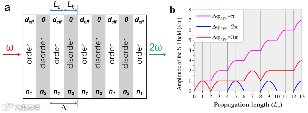 在这项工作中,山东大学晶体材料国家重点实验室于浩海教授、张怀金教授课题组从非线性频率变换的基本原理出发,提出在非线性介质内部引入周期性的无序结构,实现非线性频率变换和相位匹配的分步操控,通过附加周期相位(additional periodic phase-APP)的引入实现有序结构中相位失配的补偿,使其相位差达到2mπ(m为整数),达到与相位匹配几乎相同的效果。