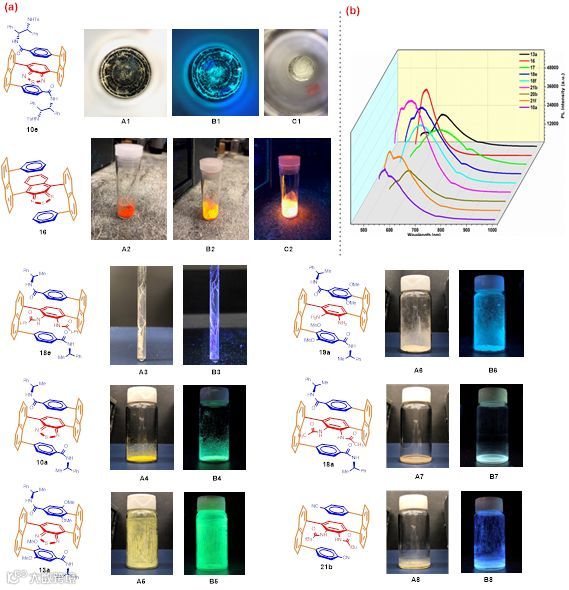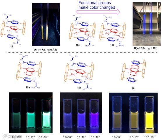 值得指出的是,随着3D多面手性产物分子中官能团的变化,其发光颜色也会改变,可以由金色变为深绿色(如下图3)。这些产物还表现出很强的聚集诱导发光(AIE),其中水的比例越高,发光强度越强。