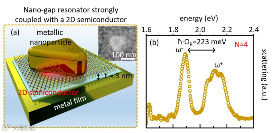 图1:(a)二维半导体和间隙等离子谐振腔构成的强耦合系统示意图,右上插示是系统的扫描电镜图。(b)强耦合系统的散射谱示例;在系统的有效激子数目仅为N=4左右时,就实现了巨大的频谱劈裂。
