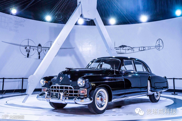 Fleetwood 60 special展厅中,弧形的展示墙、圆规形状的装置作品《几何》及P38战机元素深刻地诠释了这款意义非凡的凯迪拉克车型,二战后设计师们才思涌动,不仅大量使用空气动力学设计车身,增加了车身及车尾线条的弧度,使车身整体更趋近于圆润,而与飞机风挡设计一致的弧形风挡玻璃,也被第一次运用到了汽车上。此外,向二战英雄战斗机P38致敬的尾鳍设计理也念融入Fleetwood车型之中,开创了凯迪拉克“尾鳍设计”的先河,诞生于此的精准艺术,为凯迪拉克品牌未来的设计勾勒出了清晰的轮廓。