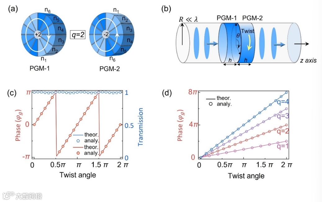 图2. 亚波长声学几何相位。(a)一对PGMs(q=2)设计的亚波长声学TCP。(b)基于TCP的声波导结构。(c) q=2的TCP波导结构中的几何相位(红色)与透射率(蓝色)的理论与解析计算结果。(d) q=1,2,3,4亚波长TCP波导结构中的几何相位。